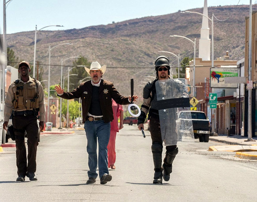 The sheriff (Phoenix, center) and his only 2 deputies (Micheal Ward left, and Luke Grimes, right) prepare to take on demonstrators in the center of town.
